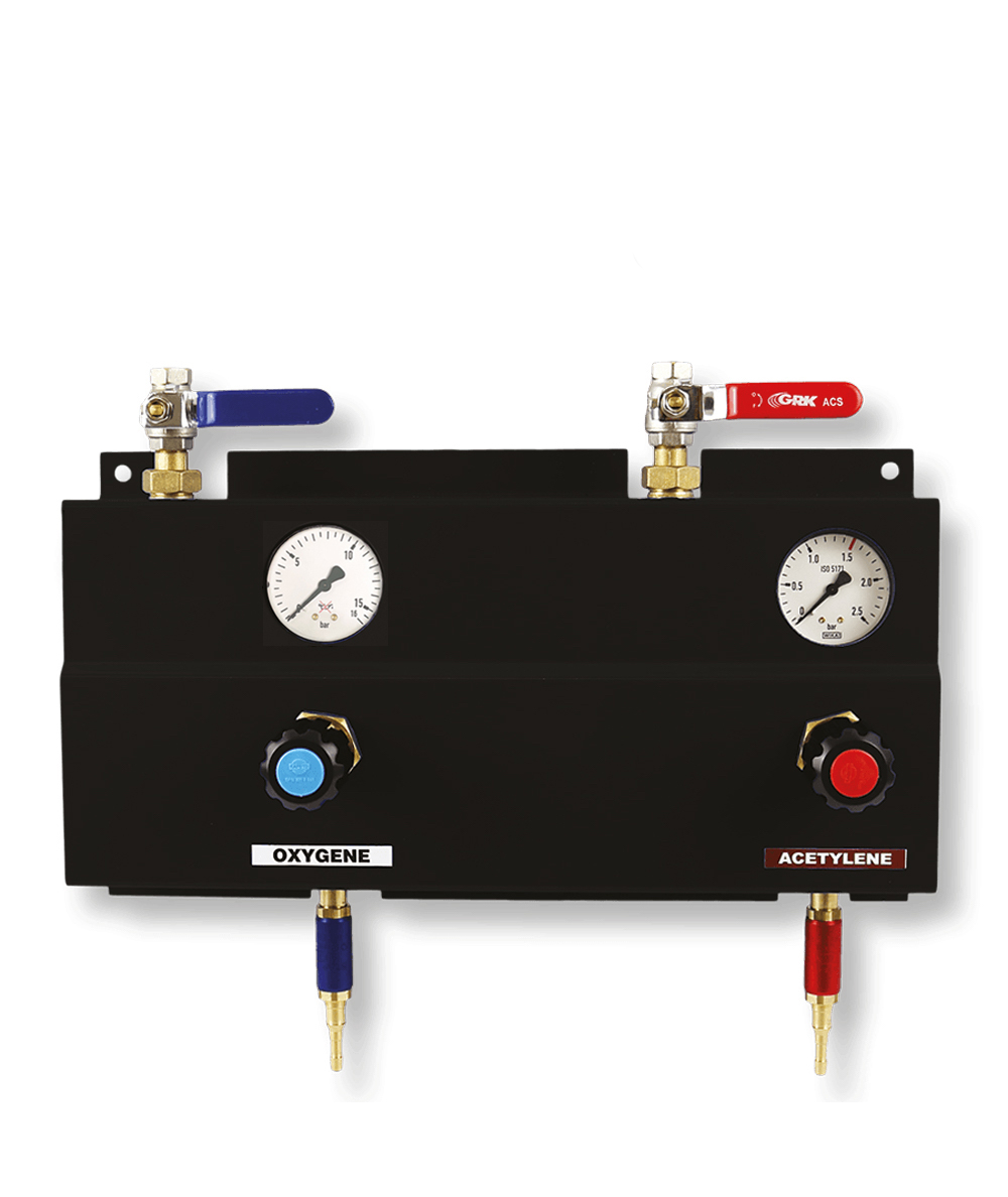 Il est équipé de deux vannes 1/4 de tour 3/8, de sorties avec anti-retours stop feu pour oxygène et Acétylène pour une sécurité d'utilisation optimale, et d'une tôle en acier peinture époxy très résistante aux impacts, rayures et certains produits chimiques.
